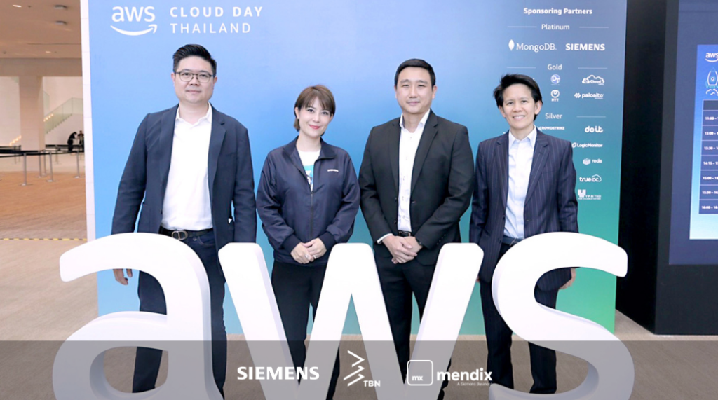Mr. Panayu Sirikrachangsri (far left), CEO of TBN Corporation PCL., together with global partner Siemens (owner of Mendix Low-Code software), led by Mr. Joseph Kong (Head of Digital Industries, second from the right), participated in the significant conference “AWS Cloud Day Thailand 2023.” During the event, Mr. Panayu Sirikornjarn delivered a keynote speech titled “Xcelerate your Digital Transformation with Mendix low-code,” highlighting the acceleration of digital innovation using the fastest methods through Low-Code tools, transforming ideas into TBN applications. Sharing the vital importance of cloud services as a primary factor driving digital transformation, TBN emphasized how cloud services are propelling digital transformation through cutting-edge technologies, and opening new business opportunities. The event took place at the Sirikit National Convention Center. Presently, TBN acts as a platform provider of Mendix Low-Code, connecting cloud service offerings from leading global cloud service providers such as Amazon Web Services and MENDIX Cloud, alongside prominent providers in Thailand. This positions TBN as a comprehensive partner for end-to-end digital solutions, empowering IT developers in Thailand to learn and explore new methodologies for cloud-based ventures, fostering the journey towards optimal cloud utilization.