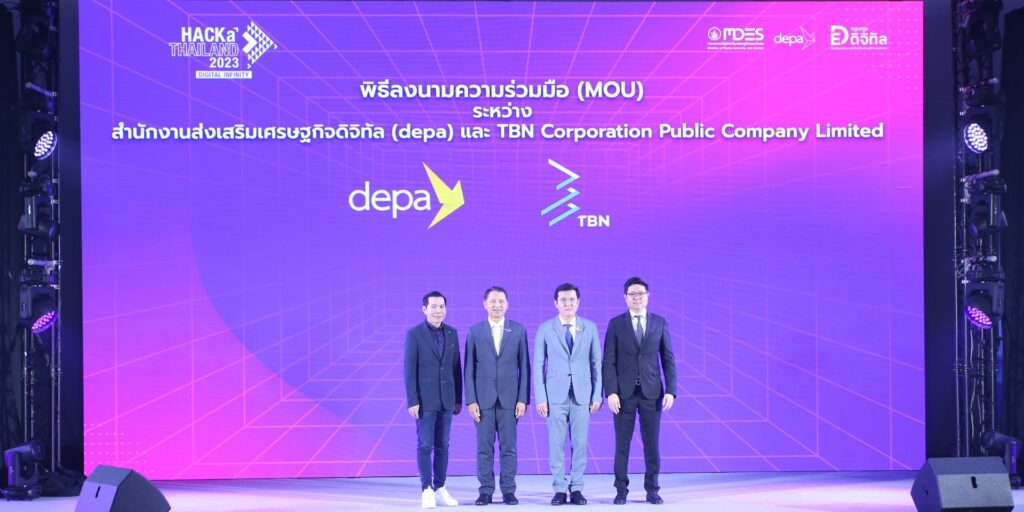 At the HACKaTHAILAND 2023: DIGITAL INFINITY technology event. Mr. Panayu Sirikrachangsri (far right), Chairman and CEO of TBN Corporation PLC., or TBN, participated in the signing ceremony of the Memorandum of Understanding (MOU) to promote digital economy collaboration with the Digital Economy Promotion Agency (DEPA). The event was graced by Mr. Chaiwut Thanakhamanusorn (2nd from the right), Minister of Digital Economy and Society (MDES), who presided over the opening of HACKaTHAILAND 2023: DIGITAL INFINITY. The event aimed to enhance digital knowledge and skills for the new generation, preparing them to face the challenges of the future. The event took place at Plenary Hall 1-4, Sirikit National Convention Center. TBN’s expertise and leadership in Mendix Low-Code technology further catered to organizations seeking digital solutions for transformative changes. The application of Low-Code in various industries facilitates efficient management, development, and adaptation of digital processes. This approach significantly speeds up development while utilizing fewer human resources. TBN is also committed to developing in-house Low-Code talents, including standard courses from Mendix Academy, to foster digital skills sharing, experiences, and exchange of ideas across various fields. This event presents a significant opportunity for Thais to experience limitless digital exposure, learn the benefits of Low-Code technology, and become part of digital industry development. This momentum drives Thailand towards a digital economy and society efficiently, contributing to a capable digital workforce and aligning with the global trend of utilizing Low-Code technology to accelerate digital transformation.